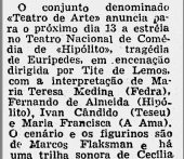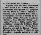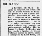 “Com este seu terceiro trabalho para o teatro, Cecília Conde dá prosseguimento à sua tarefa de renovação da linguagem musical aplicada ao teatro declamado. Mais uma vez, estamos diante de um fascinante conjunto de experiências sonoras, que impressionam pela sua originalidade e pela sua exuberante imaginação. Do ponto de vista da pesquisa sonora propriamente dita, creio que Cecilia Conde foi desta vez ainda mais longe do que nas realizações anteriores, mas do ponto de vista dramático a sua trilha me impressionou um pouco menos: uma certa falta de noção de dosagem, traduzida por uma insuficiente valorização desse magnífico recurso dramático que é o silêncio, dilui, às vezes, o impacto da sua contribuição, e em certas cenas o fundo sonoro não consegue entrosar-se harmoniosamente com a ação, chegando até a sobrepor-se a ela, em vez de limitar-se a sublinhá-la. No balanço geral, porém, a moldura sonora de Cecilia Conde constitui um dos elementos mais interessantes de Hipólito”.